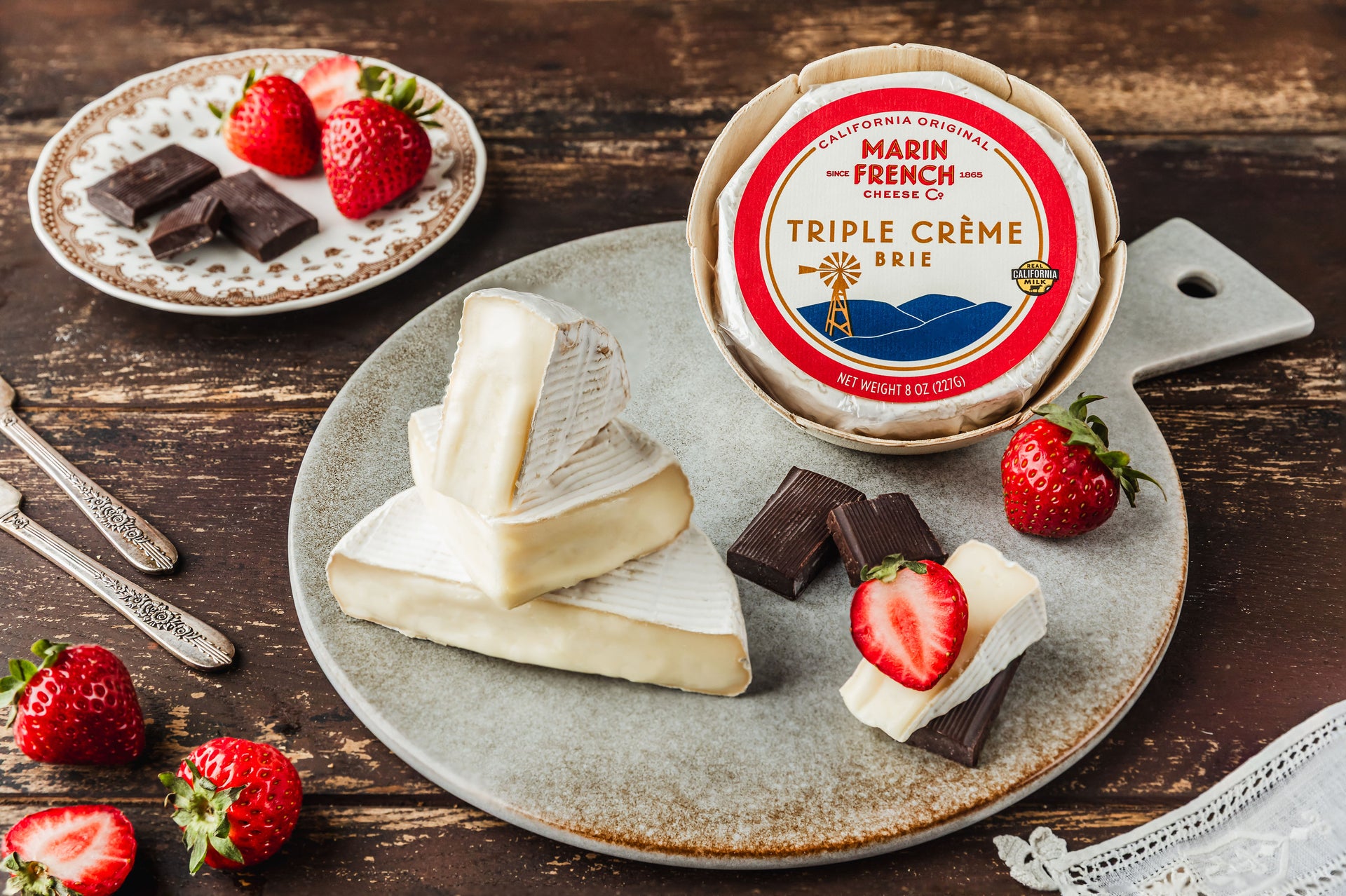 Indulge in the luxurious experience of our Triple Crème Brie cheese, crafted with care by Marin French Cheese Co. Using traditional French cheese-making techniques, we start with local milk and blend in rich cream along with a unique mix of cultures. The result is a triple cream brie that boasts a smooth, creamy texture and a slightly sweet, milky flavor profile, all enveloped in a velvety white rind. This award-winning brie has gained international acclaim, securing a Gold medal at the World Cheese Awards in London in 2005, and repeating this remarkable achievement in 2010.