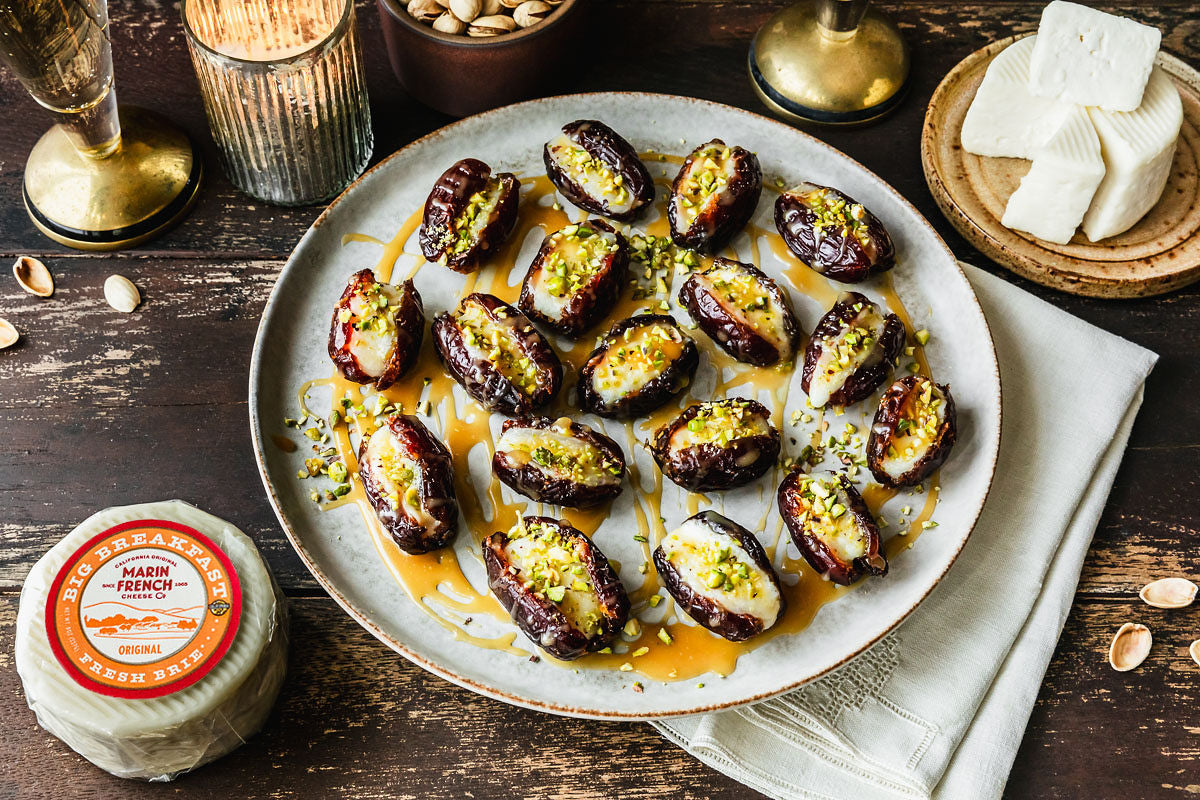 Perfect for an appetizer or dessert: creamy Breakfast cheese, salty pistachios and sweet dates make the perfect combo!